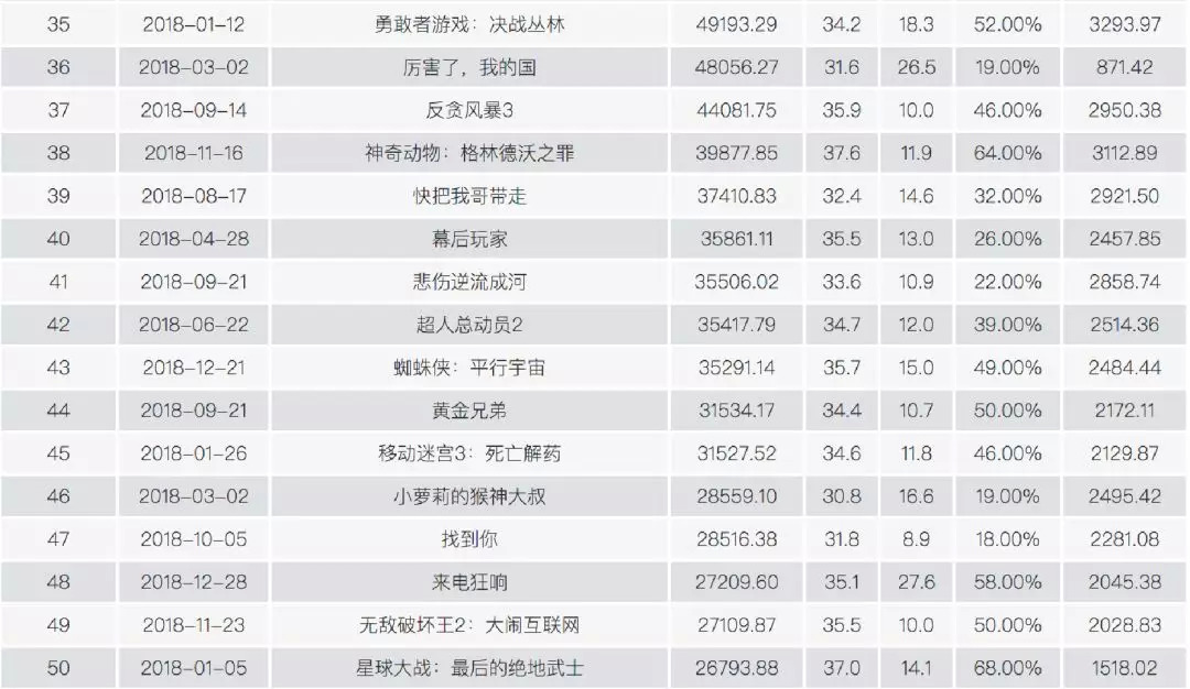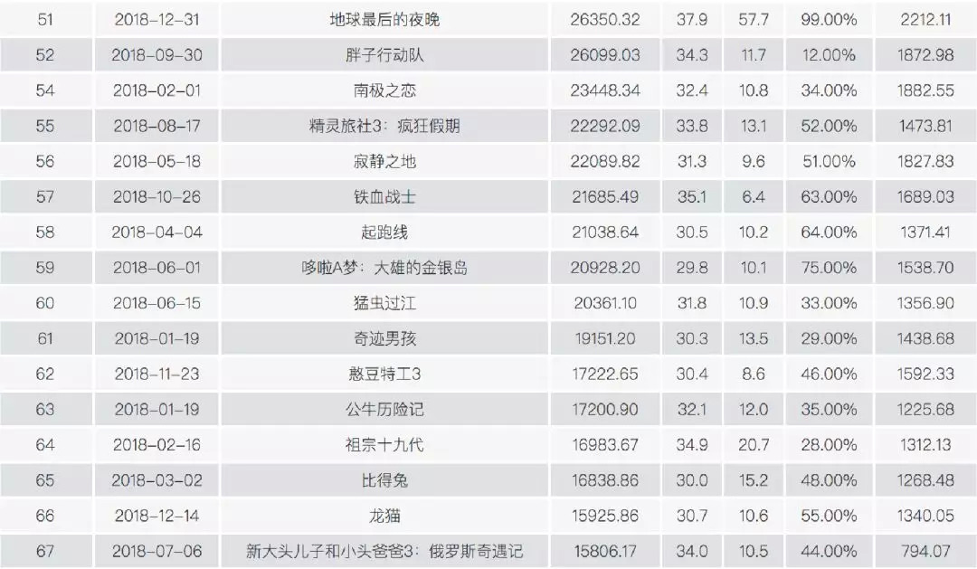 场均人次最高的影片是《四个春天》,达66人/场,《浴血广昌》以65人/场紧随其后。场均人次在40人/场以上的影片共11部,只有《捉妖记2》和《地球最后的夜晚》票房过亿。30-40人/场区间的影片共11部,除春节档的3部大片(《红海》《唐探2》和《女儿国》)外,另外8部影片票房均不过千万。