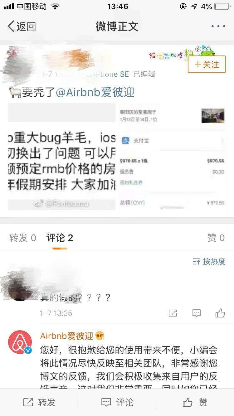 据微博网友和微信公众号“值行”反映,1月7日中午,爱彼迎的iOS版App出现汇率漏洞,使用英镑、欧元、美元搜索酒店,在最后一步添加付款方式时选择“人民币支付”,App会保留原来的数额并使用人民币来支付订单,譬如一间87美元的民宿实际支付为87元人民币,而房东收到的平台打款仍是正常价格。