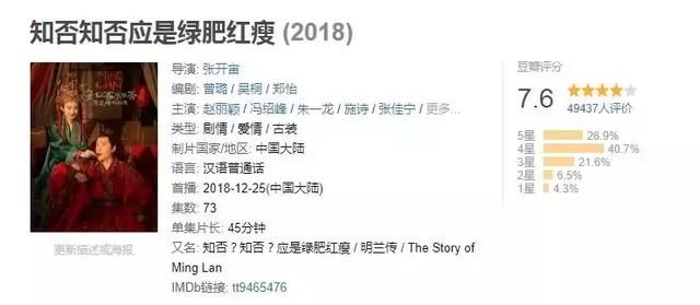 自2018年12月25日播出至今,《知否》已经站稳脚跟。从豆瓣评分来看,虽从8.1滑落至7.6分,但已然是古装IP剧里的佼佼者;从收视率看,《知否》与《大江大河》并称一时瑜亮,共同撑起晚间黄金档收视率;有赵丽颖、冯绍峰、朱一龙三位主演加持,其播放量也独占鳌头,已将21.1亿收入囊中。