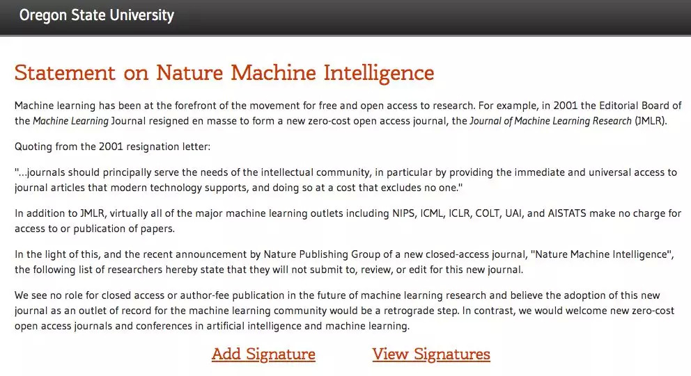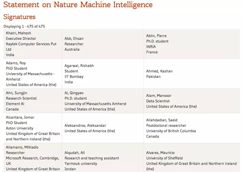 不过,《自然-机器智能》的出版之路有点坎坷,在去年4月征稿时曾遭到几百位学者的联名反对,其中包括Jeff Dean、Ian Goodfellow、Yann LeCun、Yoshua Bengio等一众AI大牛,他们反对的理由是:子刊付费订阅。