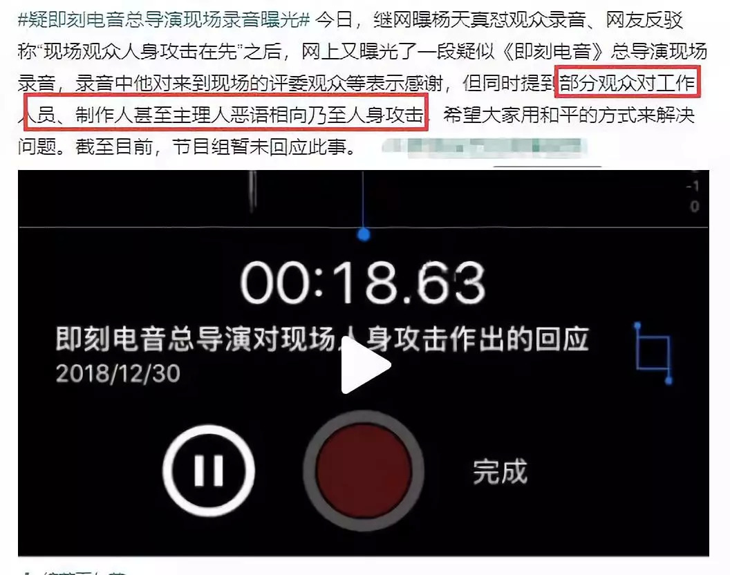 先是传出大张伟粉丝输不起,实名辱骂张艺兴;导致张艺兴生气摔矿泉水瓶怒而离场,期间还疑似被闭麦;随后张艺兴经纪人杨天真上台,跟粉丝对骂;接着导演发博,表示希望大家用和平的方式来解决问题;而大张伟和张艺兴的粉丝也成功的从2018年撕到了2019年。