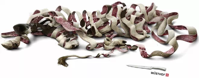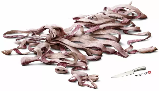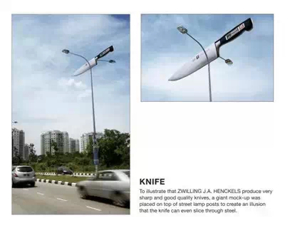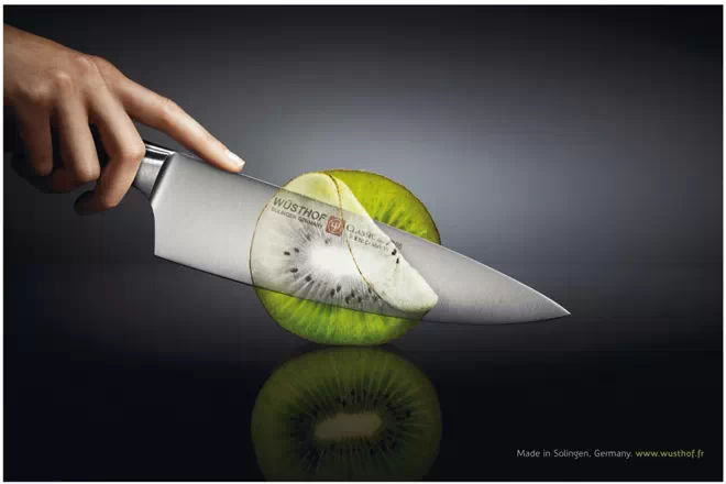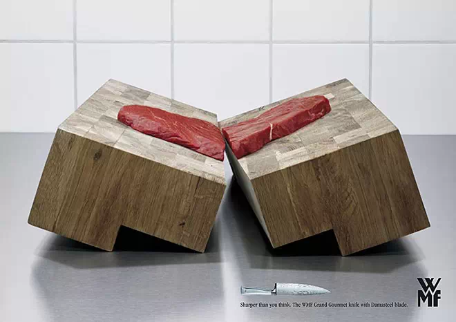 身为厨刀,锋利自然是首要任务。身为厨刀的广告,如何深层次多角度花样翻新地在一张静态图片里让观众直观地感受出锋利,也正是下列广告的使命。