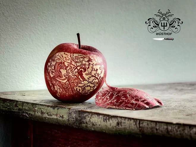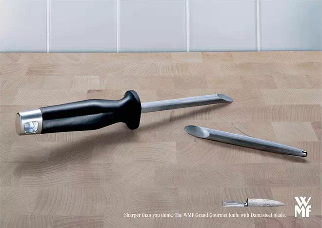 这一类广告可以看作“实用型”的升华了。各家广告不仅要体现自家刀具的性能,还得考虑如何给产品内涵注入一点艺术细菌,呃,细胞,让这些满身烟火气的刀具显得更有文化一点。毕竟马斯洛金字塔理论摆在那,人嘛,吃饱穿暖,总还是要思一点精神追求的。
