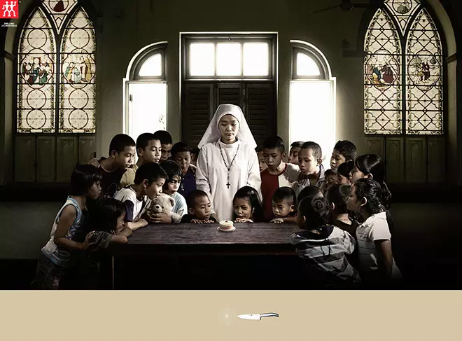 不是的,只不过它依然在打内涵牌。下面这两幅广告图里,饥饿的孩童围着一块巴掌大的蛋糕,烟尘满面的兵士盯住一只仅剩的苹果。