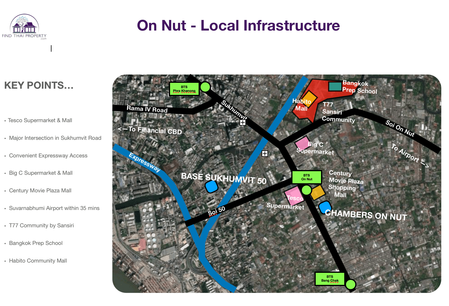 首先,简要介绍下On Nut区的地理位置。On Nut是一个重要的交叉路口,素坤逸77巷可直达素万那普机场,此外,该区域靠近50巷,方便前往高速公路。