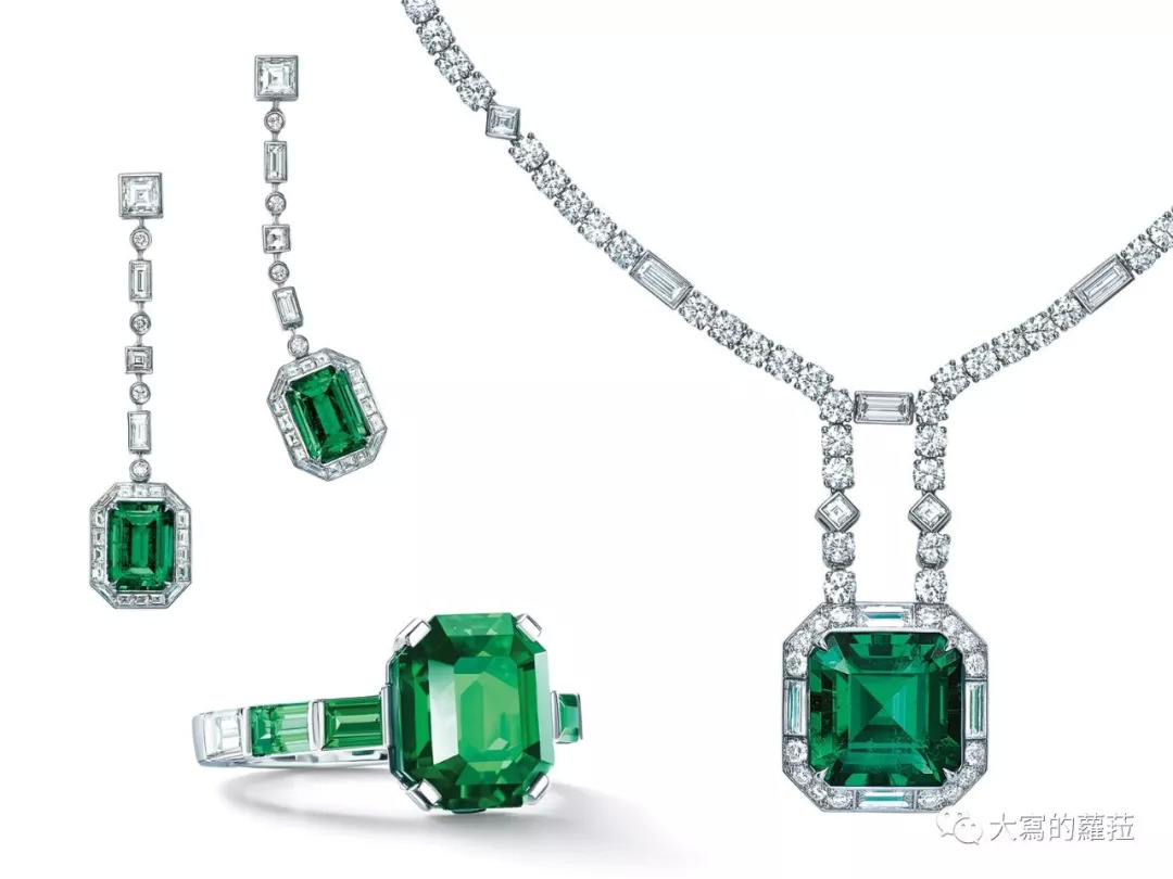 △ 蒂芙尼2018 Blue Book高级珠宝系列铂金镶嵌祖母绿戒指,以及高级珠宝系列耳环与项链。