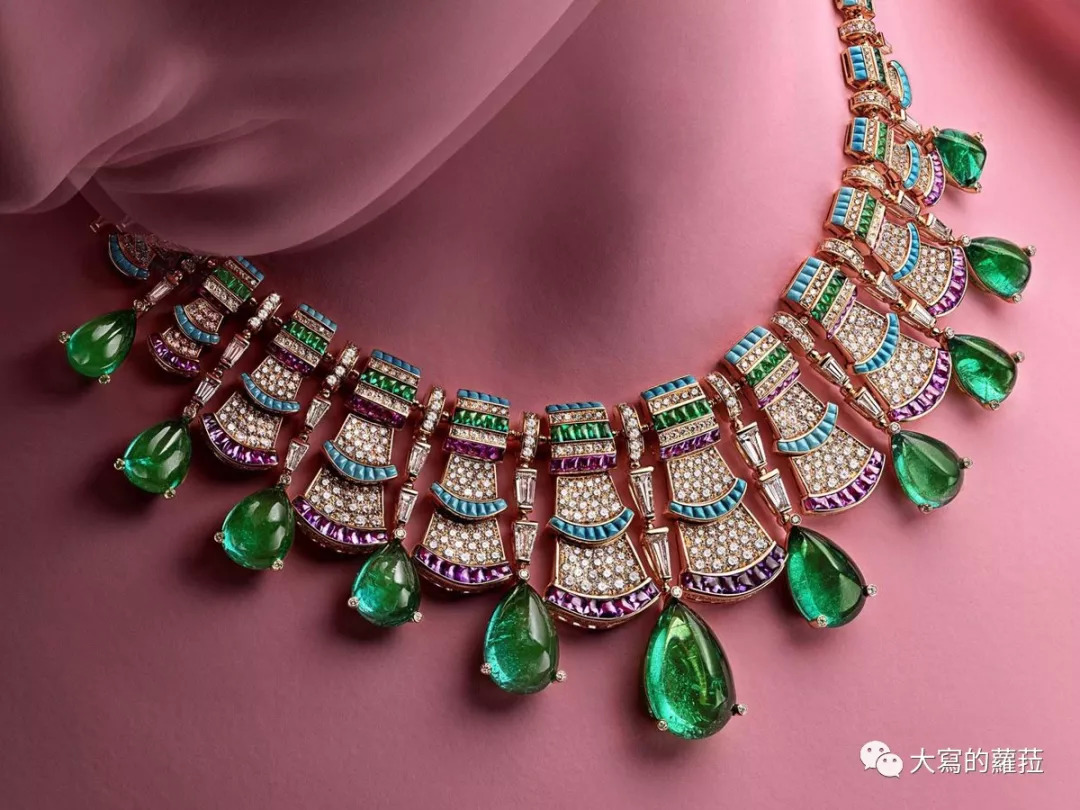 △ BVLGARI宝格丽Wild Pop高级珠宝系列Precious Ruffles项链,镶有祖母绿、紫水晶、绿松石与钻石。