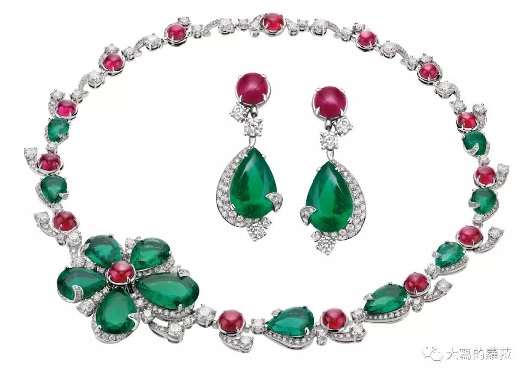 △ 宝格丽Wild Pop高级珠宝系列Feast of Flowers项链与耳环,项链镶嵌12颗赞比亚祖母绿(45.15 克拉),耳环镶嵌 2 颗梨形赞比亚祖母绿,搭配饰以红宝石与钻石。