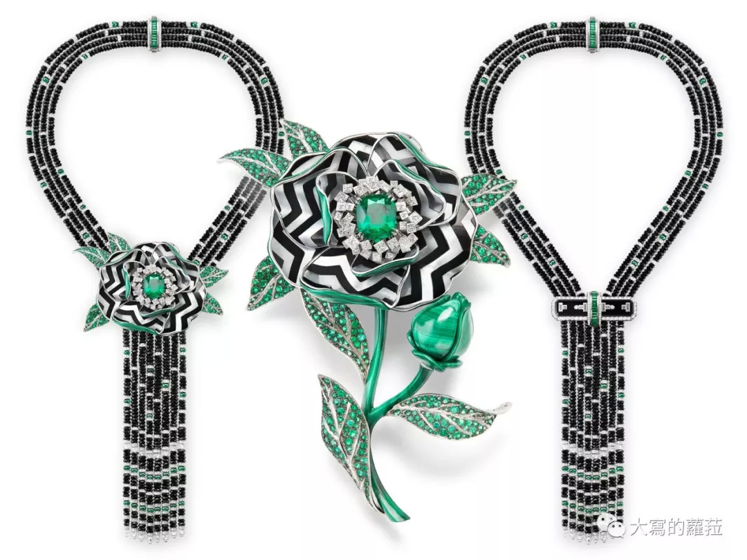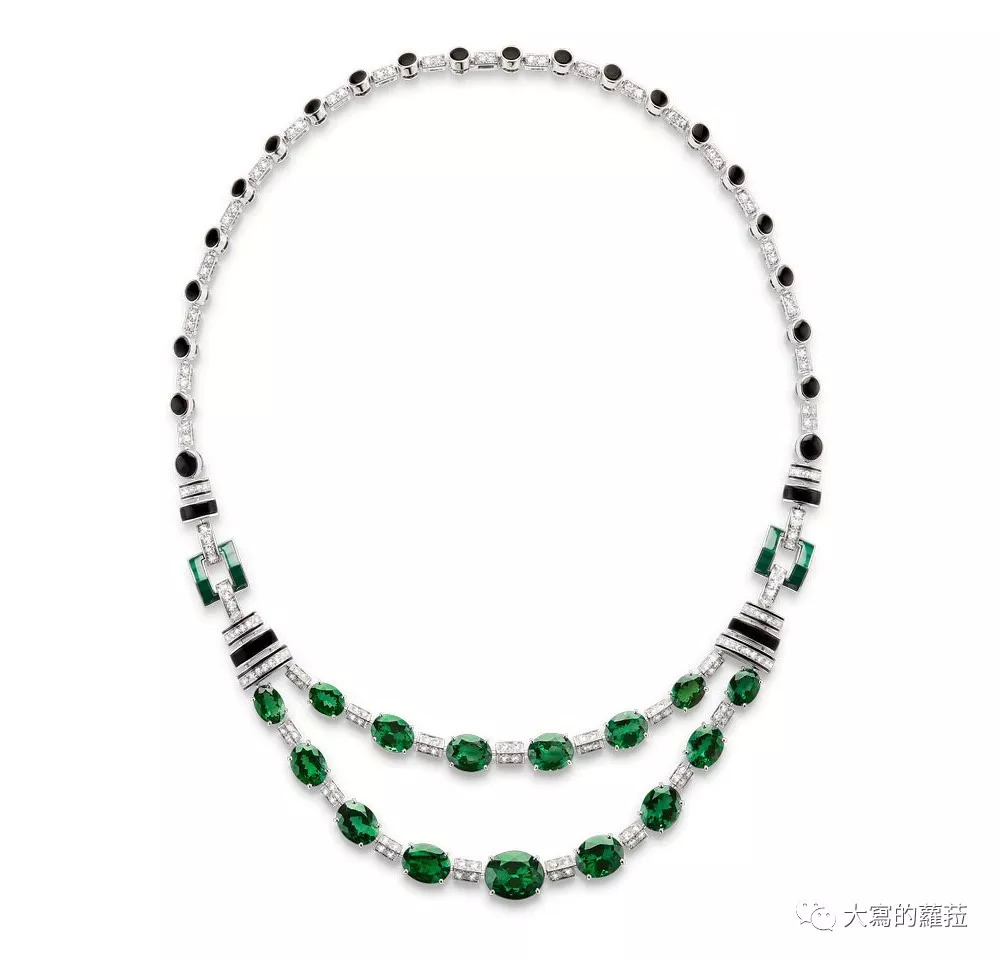 Boucheron宝诗龙高级珠宝系列作品中,一款以装饰艺术为创意的项链“Riviere Art Déco”,就是以铬绿碧玺、孔雀石搭配锆玛瑙、钻石,重返装饰艺术充满绿色与黑色的异国风情的摇曳丰姿。