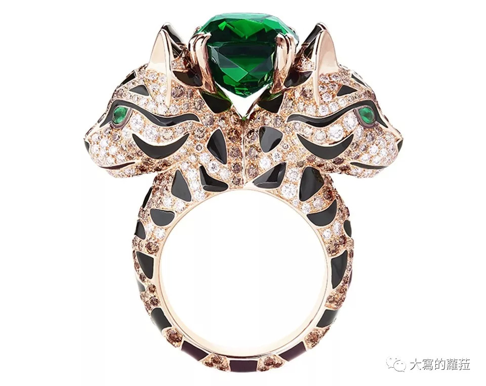 △ Boucheron宝诗龙动物系列Fuzzy豹猫戒指中央镶嵌了单颗9克拉绿碧玺。