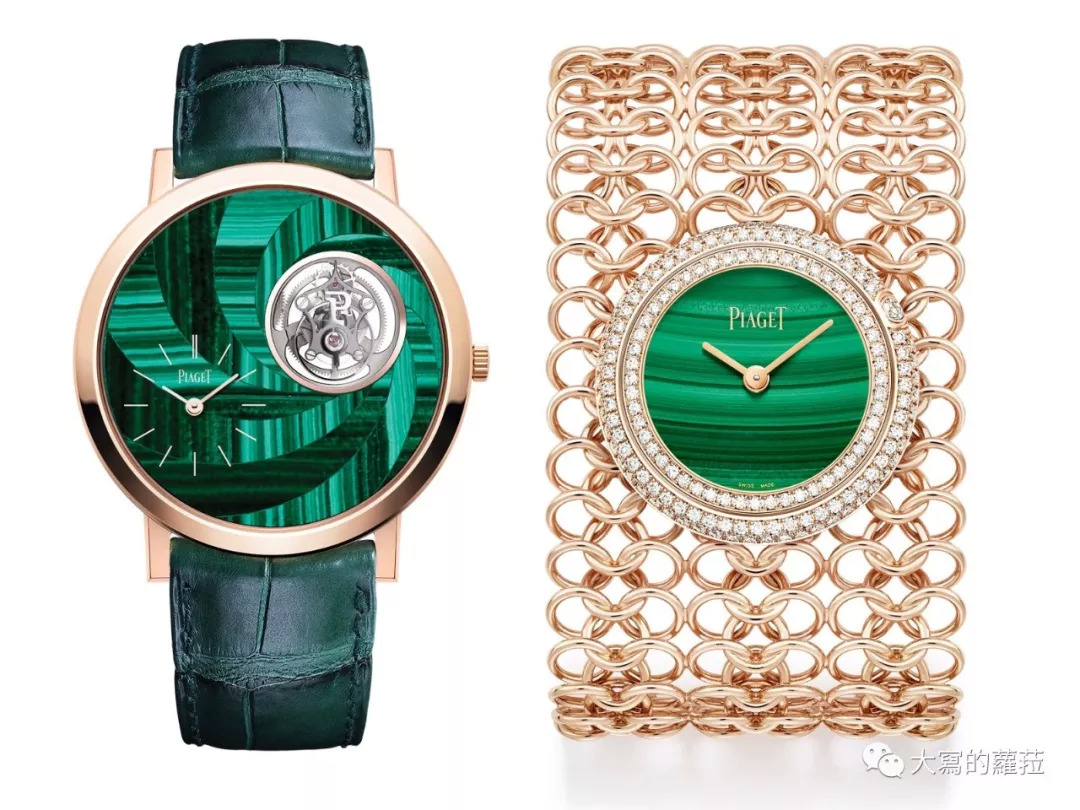 △ 伯爵2018年所推出的Piaget Altiplano孔雀石细工镶嵌工艺陀飞轮腕表(左)与孔雀石面盘的Possession手镯腕表(右)。