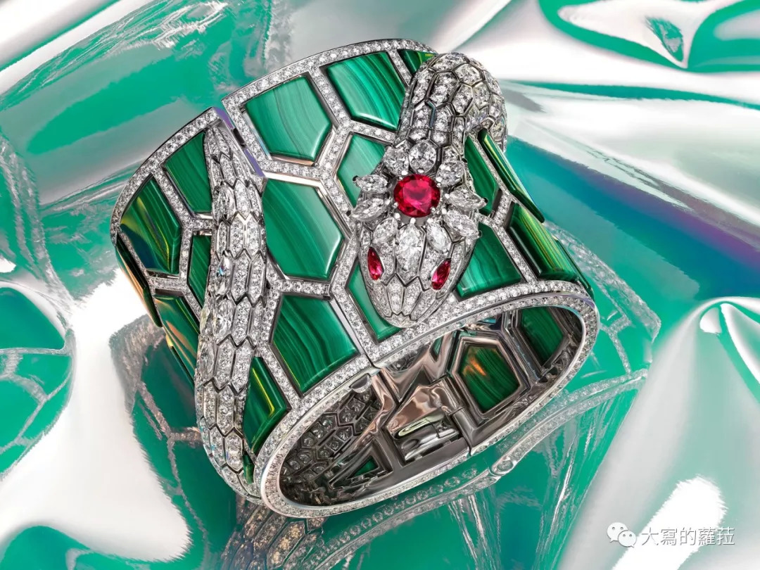 △ 宝格丽Wild Pop高级珠宝系列Serpenti My Handcuff Watch腕表,手环嵌有孔雀石。