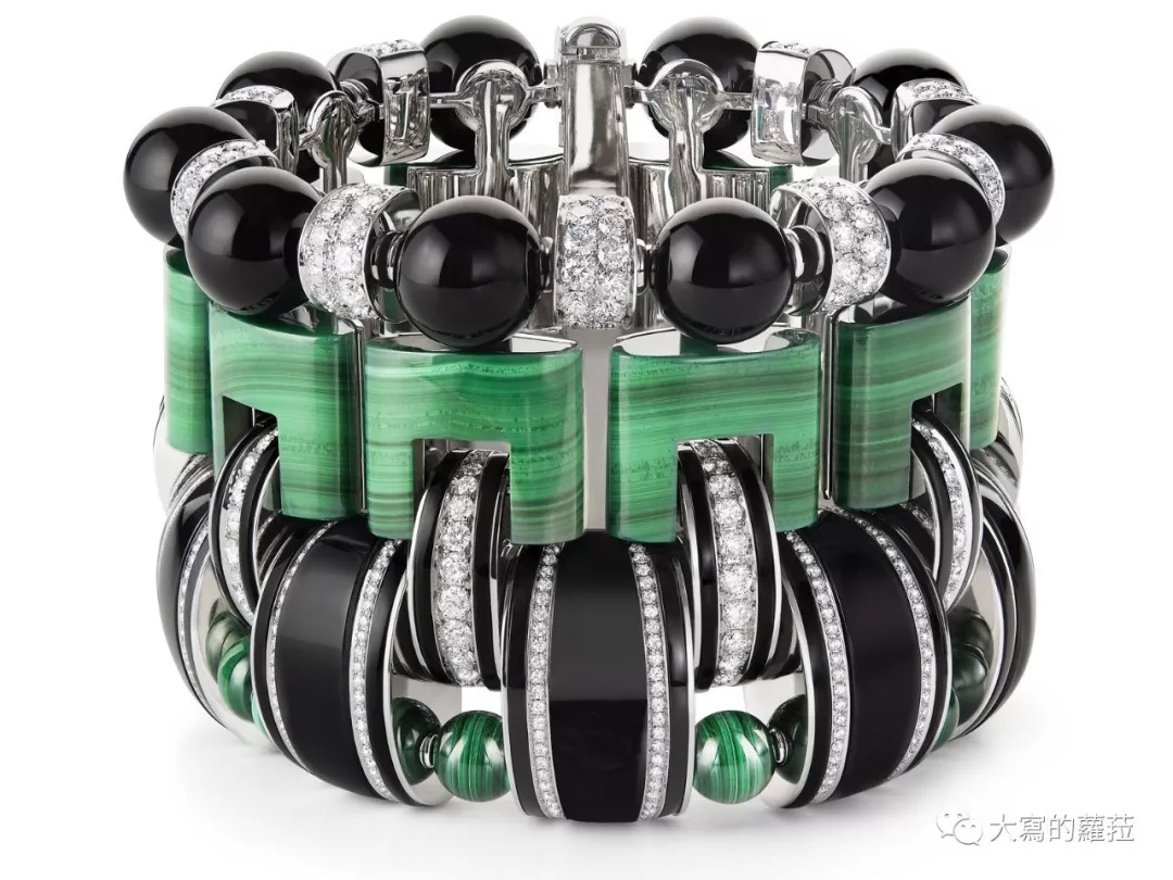 △ 宝诗龙Nature Triomphante自然盛典系列Surréaliste超现实主义Manchette Graphique手镯,以孔雀石搭配缟玛瑙与钻石。