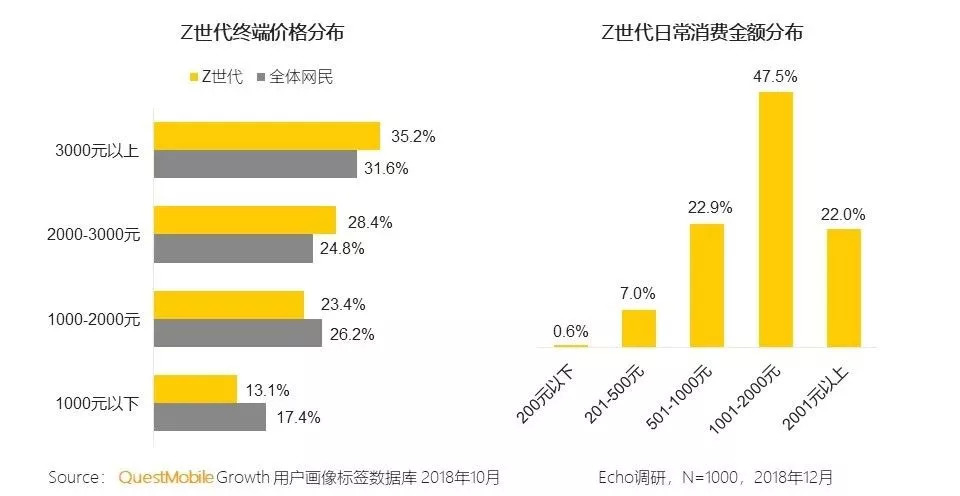 QuestMobile数据显示,截止2018年10月,互联网的Z世代用户突破3.69亿,整体规模不断扩大且保持快速增长。一方面,Z世代的成长极大程度地受到互联网的影响,属于“网络原住民”,他们对互联网产品更注重体验和尝鲜。另一方面,受益于经济快速发展,Z世代的物质条件和受教育程度相对更好,有着更强的消费力。QuestMobile数据显示,Z世代群体中,日常消费在1000元以上的群体占比高达69.5%。而且,Z世代的在线消费意愿更强,他们之中有近七成的用户线上消费占比超过40%。