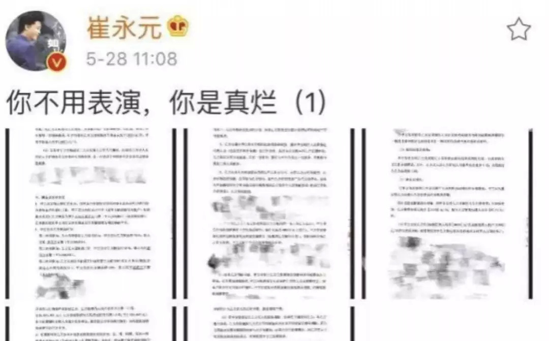 5月28日,崔永元在微博发文称“你不用表演,你是真烂”,并附上了五张照片,疑似范冰冰与《手机2》剧组的签约合同。5月29日,崔永元接上条微博再次疑指范冰冰签了两份合同,称除了自己曝光的那份合同,范冰冰还签了另外一份大合同,而大合同的片酬是五千万,这在行业内被称为“一小一大合同”。