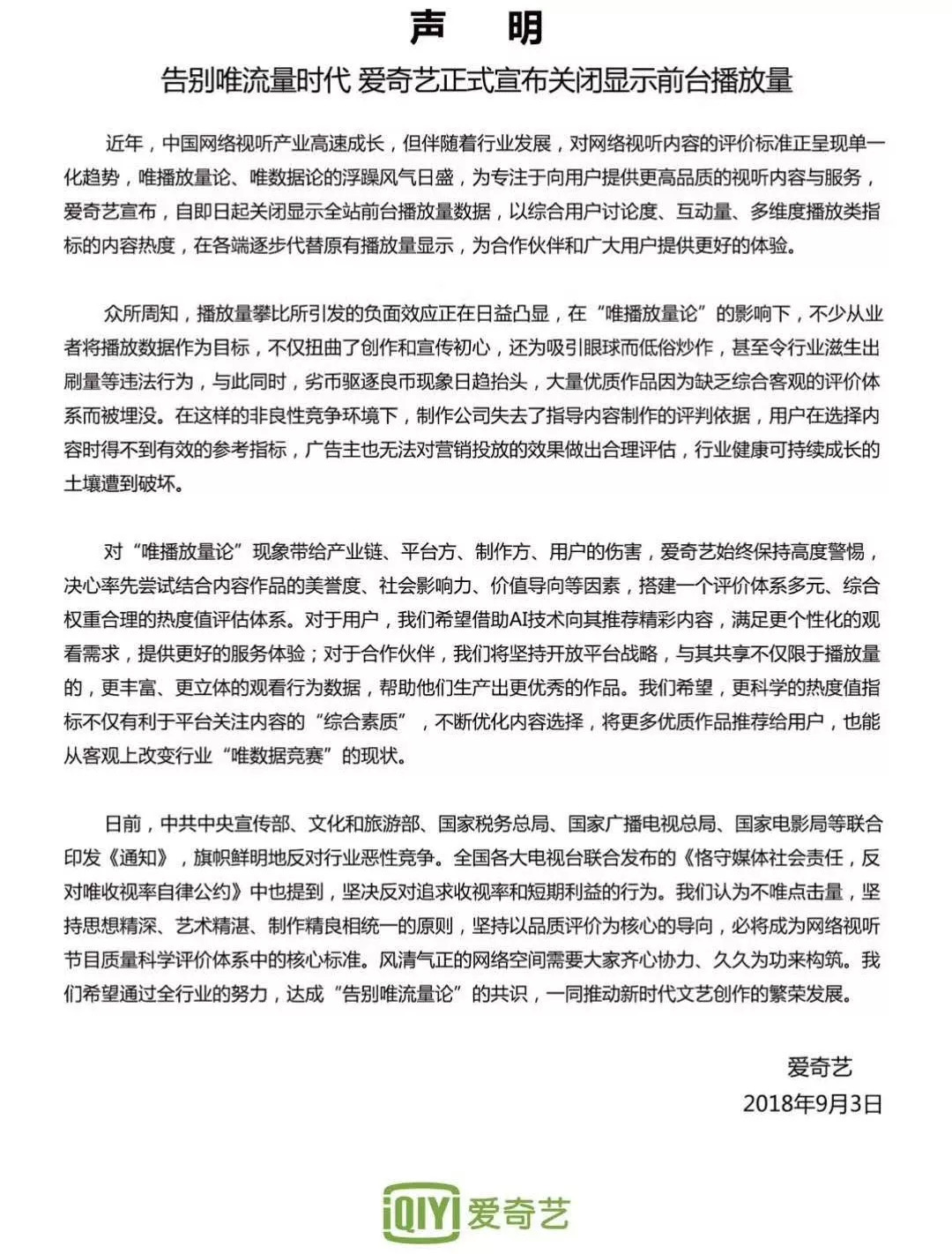 在这样的发展环境下,9月3日,爱奇艺在官方微博发布声明称:告别唯流量时代,爱奇艺正式宣布关闭显示前台播放量,而以综合用户讨论度、互动量、多维度播放量指标的内容热度代替。这一举动不仅增大了数据造假难度,也带动整个行业重新考量内容受欢迎程度的真实性。数据泡沫引发的繁荣表象开始被剔除,影视行业也将更加注重内容本身的质量和影响力,进而推动行业加速进入内容争霸时代。