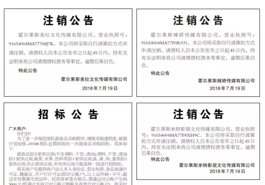 税改事件随即引发了“霍尔果斯大逃亡”,从6月至10月,共计有100多家在霍尔果斯注册的影视公司公布了申请注销的公告。仅在8月27日当天便有25家公司在《伊犁日报》上刊登了注销公告。在这些注销的公司中不乏冯小刚、刘诗诗、徐静蕾等明星为实际控制人的公司。