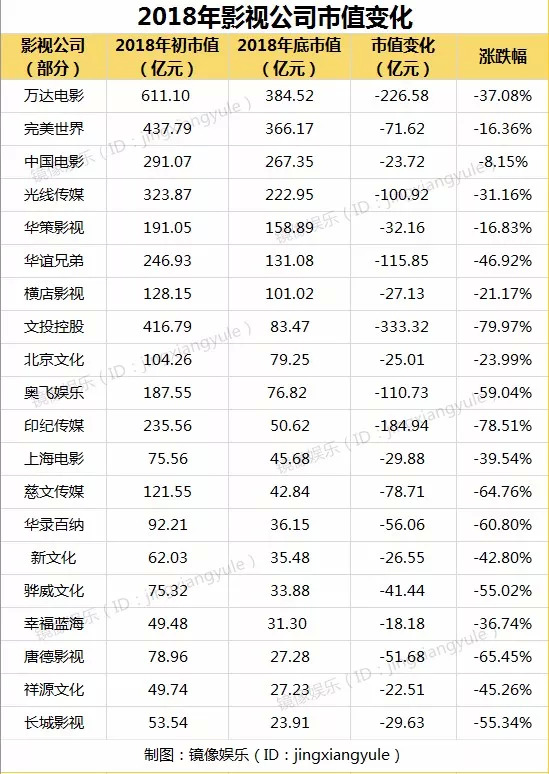 在影视公司方面,整个影视资本市场不容乐观,影视股下跌非常严重。从镜像娱乐(ID:jingxiangyule)统计的20家上市影视公司来看,去年一年无一家公司市值增长,市值总蒸发超1600亿,跌幅在50%以上的公司就高达8家。