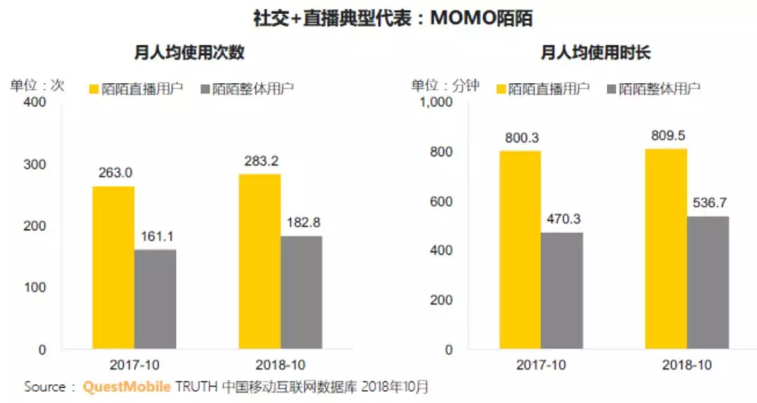 从2015年12月至2018年9月,陌陌月活跃用户数从6980万增长至1.105亿。2018年第三季度陌陌直播服务营收27.69亿元(约4.069亿美元),同比增长34%。