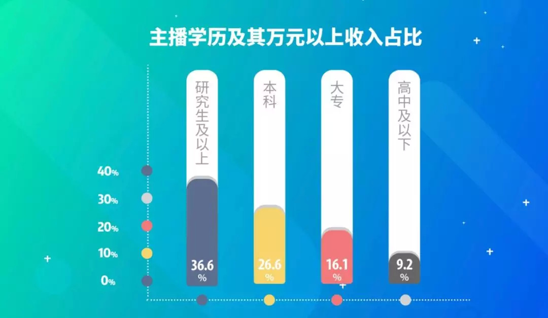 与此同时,和此前常见的误解不同,主播的收入与学历成正比,学历越高收入越高。职业主播中大学以上学历(含大专)占比为44.5%,36.6%的研究生以上学历主播月收入过万。