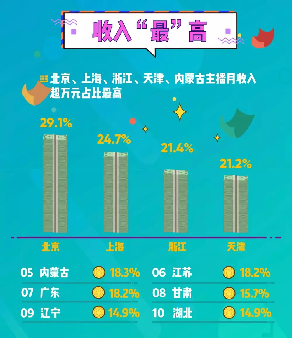 而最赚钱的主播还是在一线城市,收入超过万元比例最高的TOP3省市分别为北京、上海、浙江,占比为29.1%,24.7%,21.4%,这些省市经济发达,年轻人占比高,主播学历也相对较高。这也符合“学历越高收入越高”的主播定律。