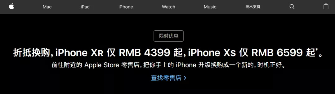 在苹果官网首页,黑底超大白色字体,醒目地推出了以旧换新的的服务,不仅可以用苹果旧手机折价购买新手机,华为、小米、OV都可以,可谓来着不拒。