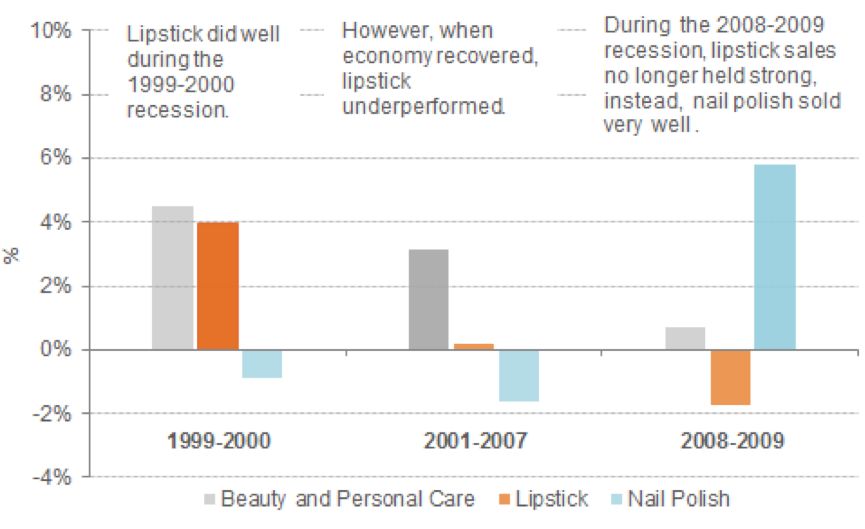 当经济不景气时,口红的销量反而会显著上升,反之则相反。