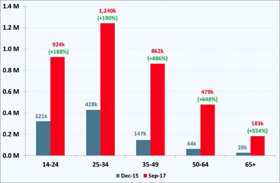 根据Royal Mogan提供的报告,澳洲的打车软件Uber用户从2015年2017年的增长迅猛,目前约370万澳洲用户在使用Uber。