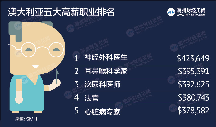 统计结果显示,外科医生收入无疑是澳大利亚最高薪酬岗位之一。实际上,在澳大利亚高薪职业排名前三十强中,除了两个职业外,其他职业无一例外的是医学专家。具体而言,在外科手术专家中,神经外科医生收入又排名最高,中位年收入为423,649澳元。
