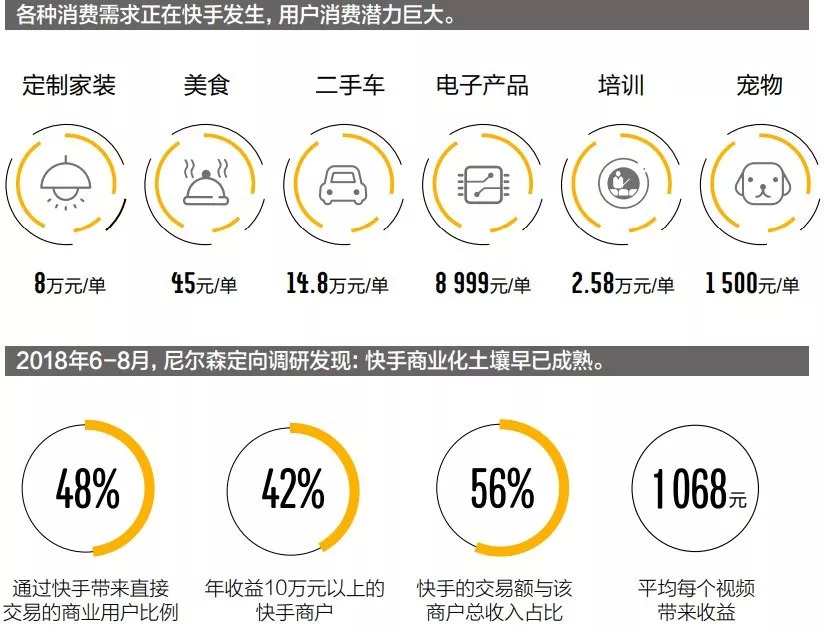 信任是所有用户消费决策的关键环节,稳住这一环的快手已搭建起稳固的商业基础。著名市场调研公司尼尔森在2018年6-8月调研了快手商户,其给出报告称:平台上48%的商户从快手上直接接到了生意,其中42%在快手上年收益超过10万元,平均每个视频可以带来1 068元收益。对于有些商户来说,快手的交易额甚至能占到50%以上。