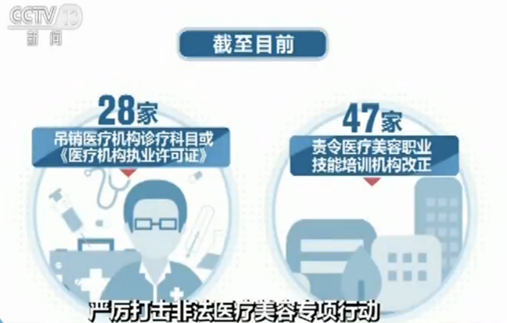 近年来,越来越多的消费者选择“微整形”医疗美容,一些人为牟取利益,非法制售使用胶原蛋白、肉毒毒素等药品和医疗器械,危害消费者健康。此次专项行动重点打击无证行医,查处生活美容机构以及其他机构未取得相应资质,开展注射美容等医疗美容行为;查处利用宾馆酒店、会所、居民住宅等场所违法开展医疗美容行为;打击走私医疗美容相关药品、医疗器械行为;查处不具备资质的培训机构违规开展“微整形”等医疗美容培训。截至目前,共吊销医疗机构诊疗科目或《医疗机构执业许可证》28家,责令47家医疗美容职业技能培训机构改正,2家停业整顿,责令743条医疗美容广告予以改正。全国公安机关共捣毁制售假药黑窝点728个,总涉案金额近7亿元,全国海关立案侦查、调查各类胶原蛋白、肉毒毒素等走私违法犯罪案件912起。
