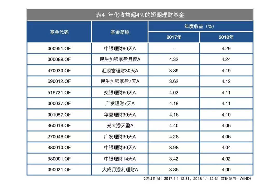 除了前面流动性强的货基,还有流动性稍差、但收益率稍强短期理财基金。如果自己资金的闲置期限较长,可以考虑在银行购买短期理财基金,这类产品收益率普遍稍高。前三类产品年化收益率4%算是佼佼者,这样的成绩在短期理财产品中却不少,适合资金使用期限明确的投资人。