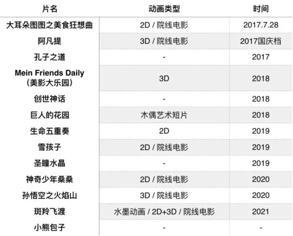如今一年半的时间过去了,这个表格上的动画项目,除了《大耳朵图图之美食狂想曲》如期上映,《阿凡提》(即《阿凡提之奇缘历险》)延迟到了2018年10月国庆档上映之外,已经很少听到其他作品新的消息,项目推进速度显然较为缓慢。