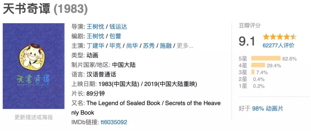 2012年,将1961版原片重新修补并加入3D效果的《大闹天宫》,豆瓣评分6.9分,票房4200万;