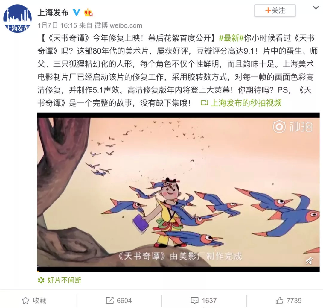 1月7日下午,上海市政府新闻办公室官方微博@上海发布 称,《天书奇谭》修复版即将在2019年上映。
