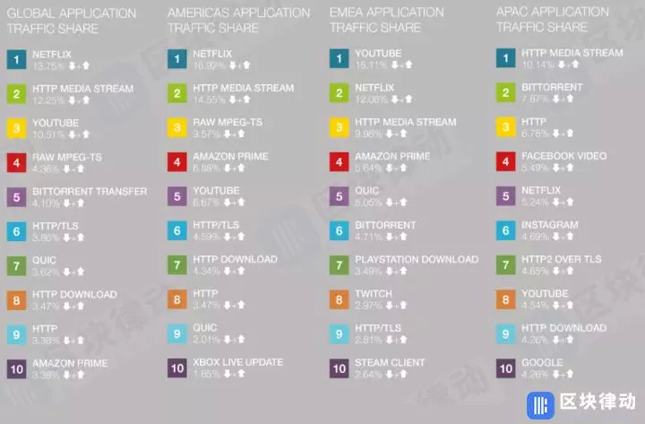 根据加拿大宽带管理公司 Sandvine10 月份的报告数据显示,目前全世界应用流量份额中 Netflix 占据了 13.75%,HTTP 流媒体占据了 12.25%,Youtube 占据了 10%,Raw MPEG 占据了 4.36%,BitTorrent 文件传输仅剩 4.1%。