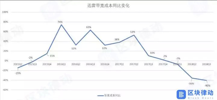 在迅雷的历年财报中,区块律动 BlockBeats 发现,迅雷的宽带成本在 2017 年 Q3 之前连续 2 年同比增长,但是在 2017 年 Q3 玩客云爆卖、星域云 CDN 业务起步之后,迅雷的宽带成本由涨转降,到 2018Q3 宽带成本同比下降 40%。这与在短短一年的时间里,在全国建起的百万个玩客云节点有直接关系。