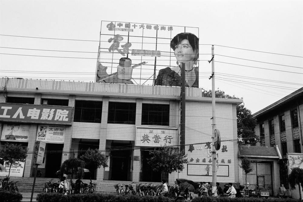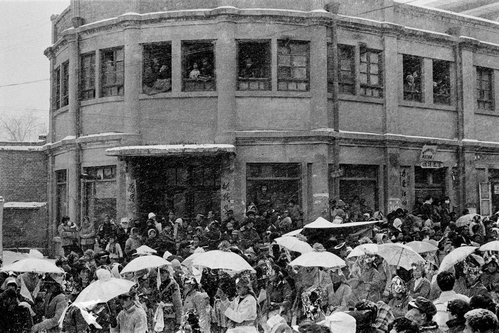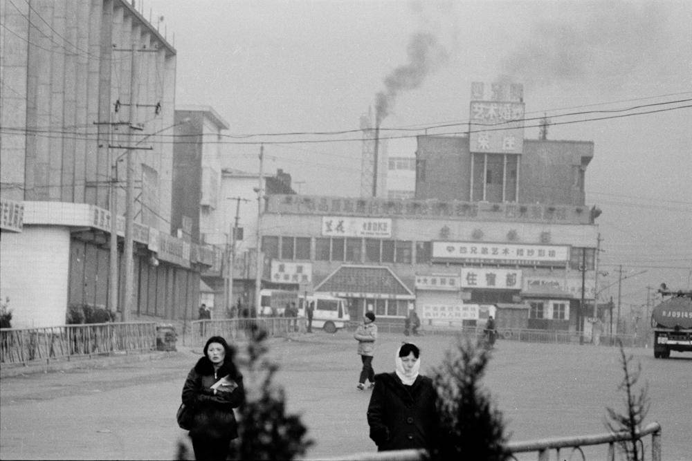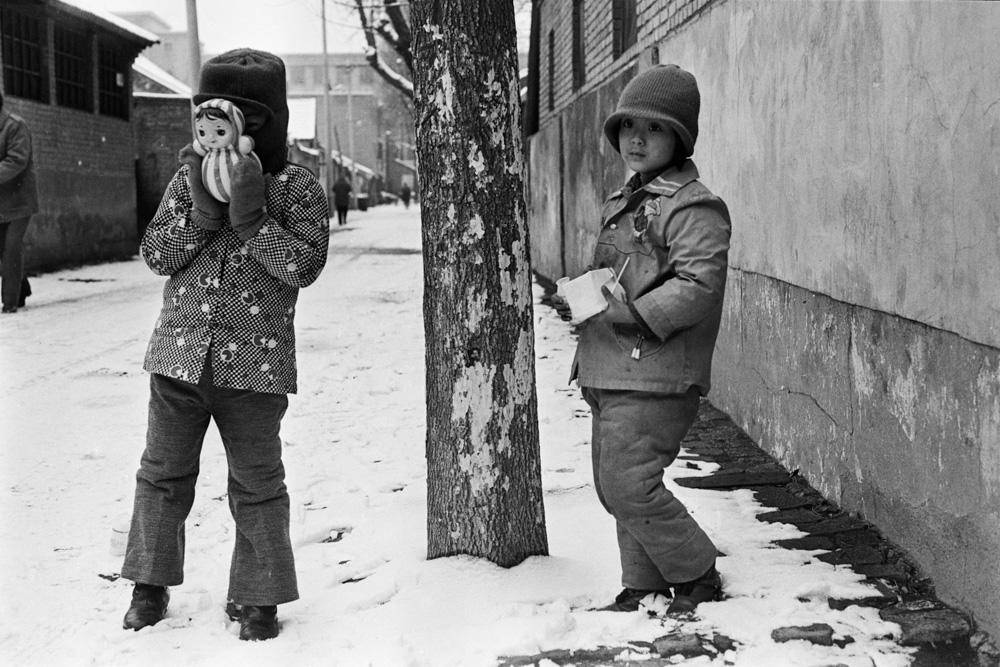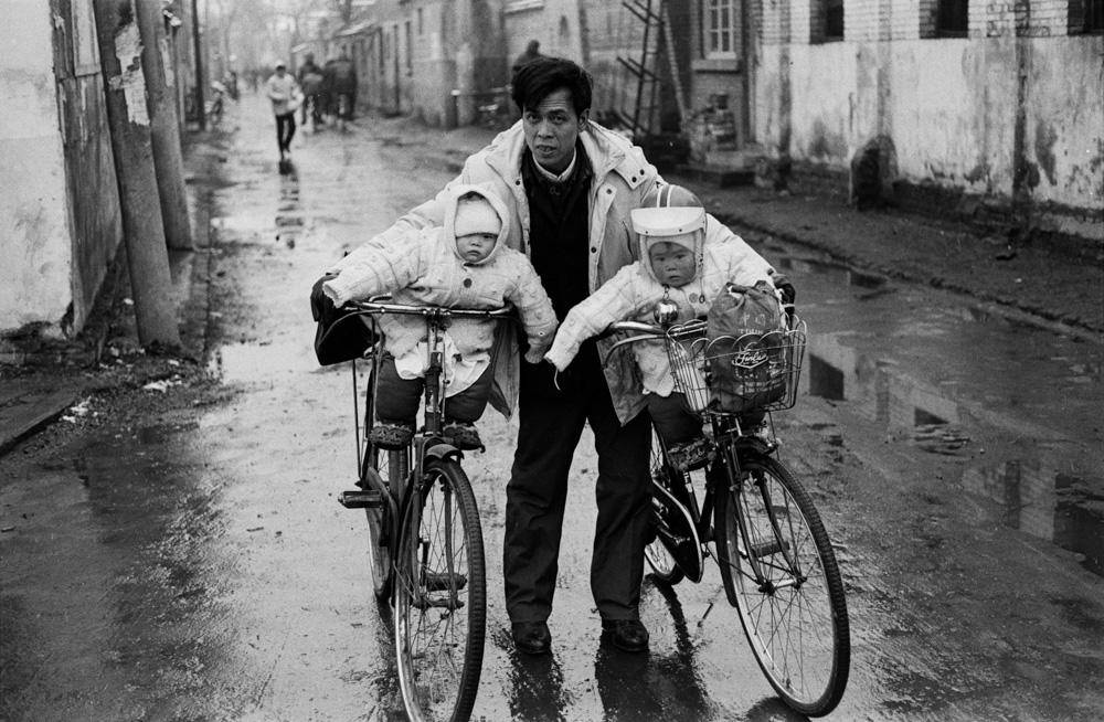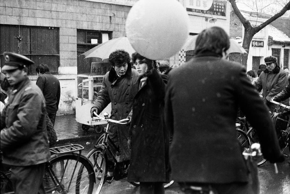 这组作品都是街头抓拍,拍摄时间是上个世纪80到90年代。大部分是北方的普通人和日常生活,也有一些来自南方街头。我们看到大雪中的人们,双手推着两部载着双胞胎女儿的自行车的父亲,充满热气的北方屋子,也看到深圳硕大的广告标牌,时髦的男男女女。