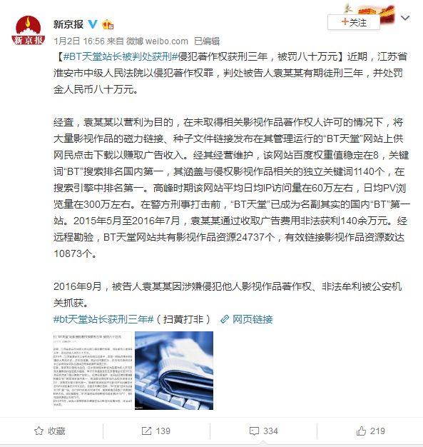 被告人袁某某为国内知名网站“BT天堂”的站长,该站点凭借数量庞大的盗版影视资源,长期占据国内搜索排行第一位,高峰时期日均访问量超过了60万。以庞大的流量为基础,袁某某凭借广告植入的方式非法牟利达140余万元,堪称是当代中国在线盗版影音市场的“龙头老大”。