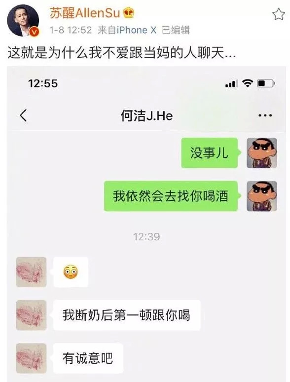今天,苏醒微博晒出与何洁的聊天记录截图。在二人的对话中,苏醒约何洁喝酒,但何洁的一句“我断奶后第一个跟你喝”,引发网友猜测,疑似她已诞下第三胎?而目前该微博已删除。