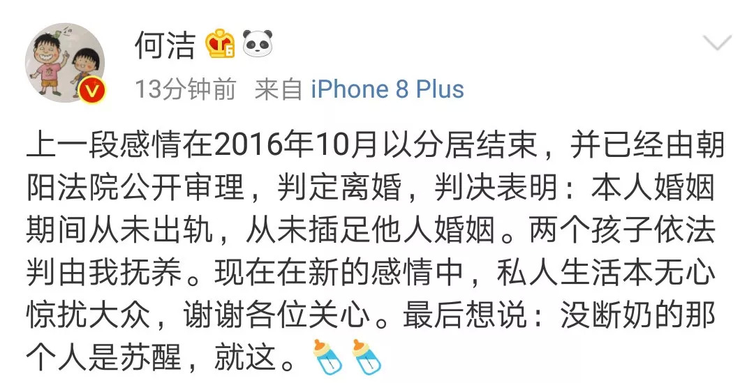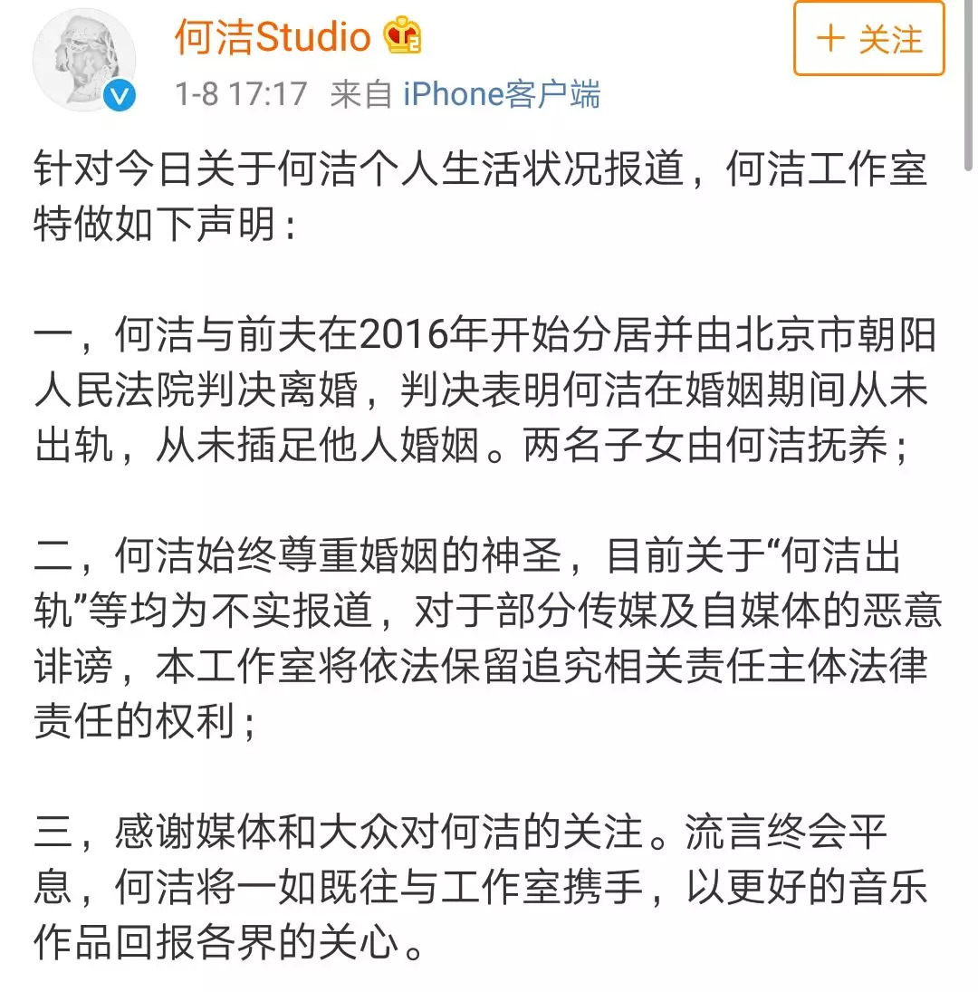 对此,何洁及其工作室发声明否认,她称上一段感情在2016年10月以分居结束,已判定离婚,在婚姻期间从未出轨,从未插足他人婚姻,同时也表示自己现在在新的感情中,工作室也强调称目前关于“何洁出轨”等均为不实报道。