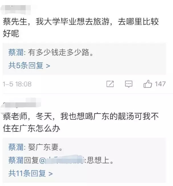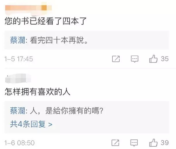最近,蔡澜与粉丝的互动引发热议,不少人认为蔡澜先生谈吐风趣,言语间充满人生智慧的凝练。比如有人问:“怎样拥有喜欢的人”,蔡澜的解答非常出乎意料:“人,是给你拥有的吗?”
