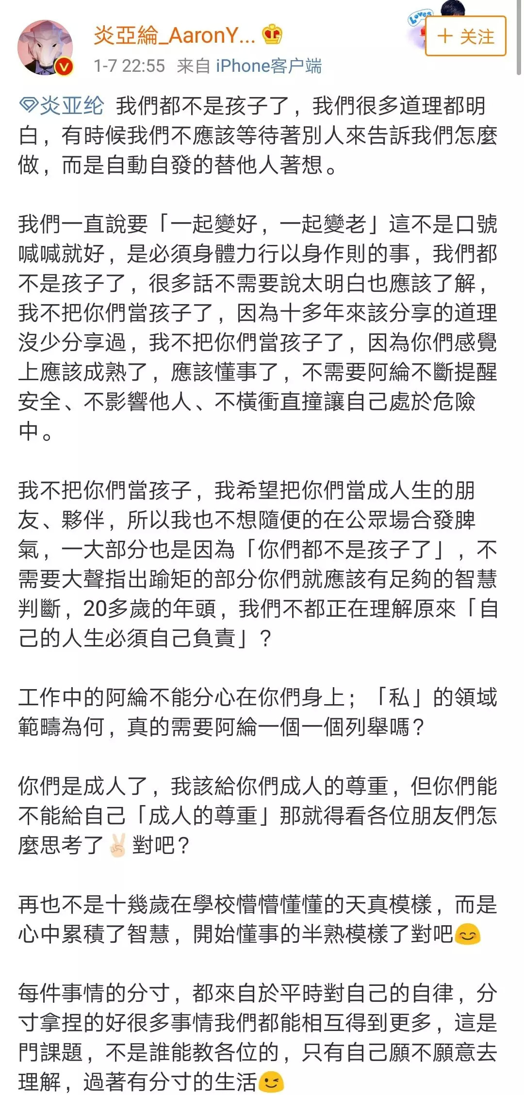 昨天晚上,炎亚纶在微博发长文,温柔劝导“私生饭”要理性追星。文中称:“希望大家能够不影响他人,也不要再横冲直撞地处于危险之中,每件事情的分寸,都来自于平时对自己的自律,分寸拿捏的好很多事情我们都能相互得到更多。”