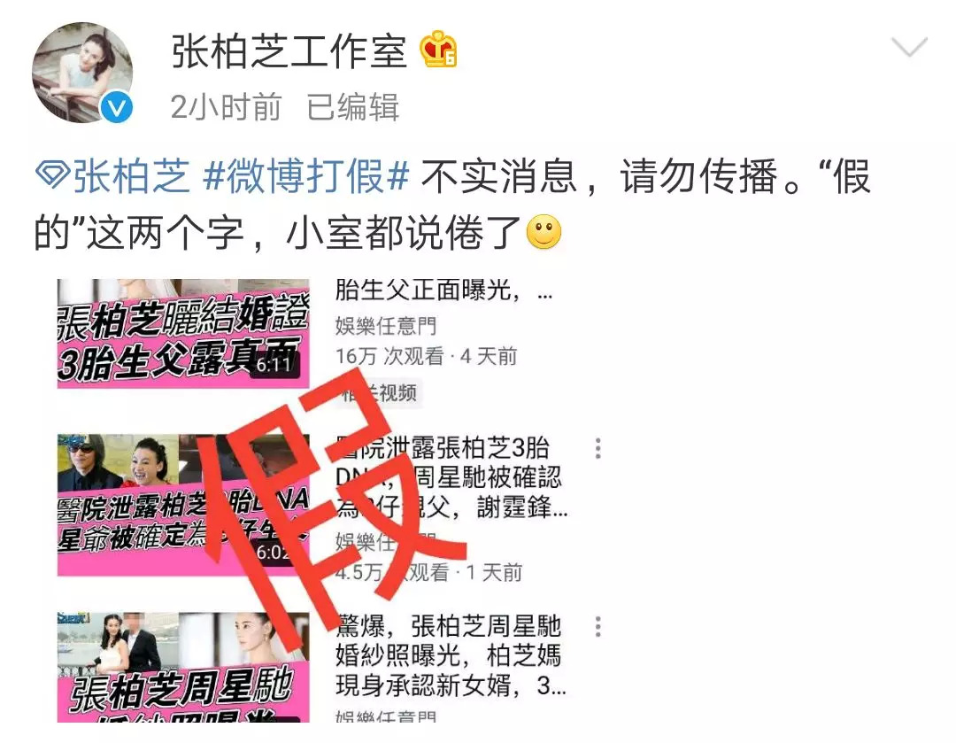 网传张柏芝第三个儿子的父亲是周星驰,并表示二人现已经拍摄完了婚纱照。对此,张柏芝工作室晒出截图并对此事进行辟谣称:“不实消息,请勿传播。‘假的’这两个字,都说倦了。”
