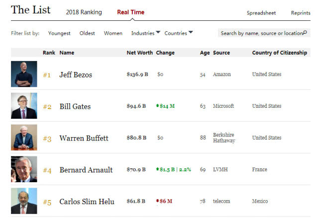 2018年10月3日,《福布斯》杂志发布2018年度美国富豪400强榜单,亚马逊CEO杰夫·贝索斯以净值1600亿美元的身价取代微软公司联合创始人比尔·盖茨问鼎榜首。这是自1994年以来福布斯榜首首次易主。