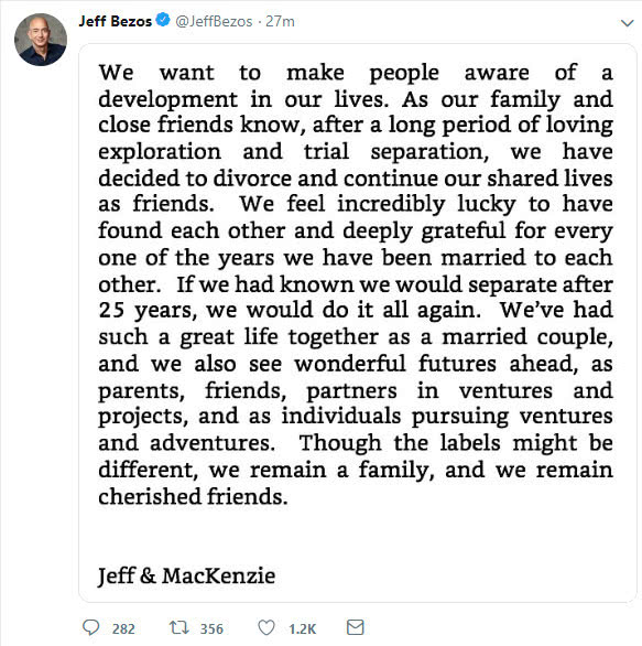 “我们想让人们知道我们生活中发展状况。我们的家人和密友都知道,经过长期的爱情探索和尝试分离,我们决定离婚,继续我们作为朋友的共同生活,”贝索斯在这份推文声明中称。