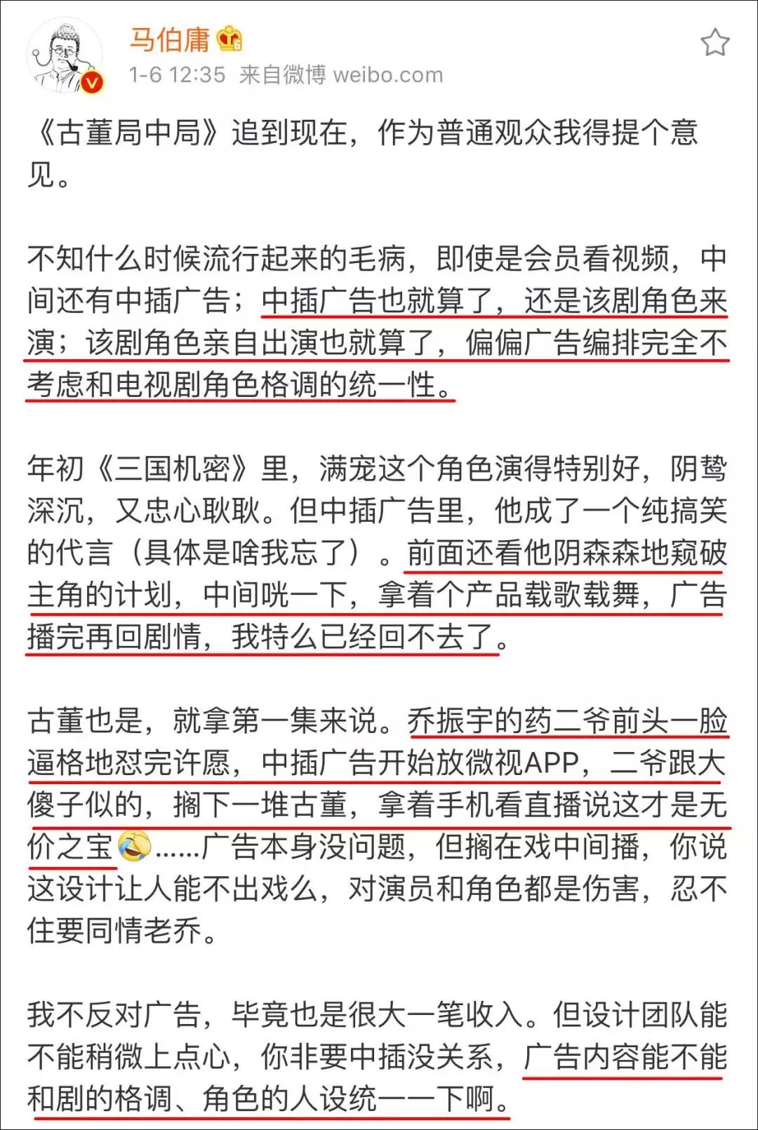 1月6日,马伯庸以自己的作品改编剧《古董局中局》《三国机密》为例,发文吐槽中插广告现象,称现在观看视频,即使是会员也还有中插广告,而广告还由该剧角色亲自出演,编排完全不考虑和电视剧角色格调的统一性,一时上了热搜。不少网友表示,终于有人说出来了,插播广告真的很出戏。不过,也有网友调侃,《古董局中局》宣发太穷了,第一次热搜都要作者亲自带,还是趁着热搜赶紧安利一下剧。