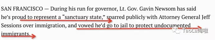纽森曾在移民问题上与司法部长杰夫塞申斯(Jeff Sessions)公开争论过,甚至说要亲自去监狱保护非法移民!
