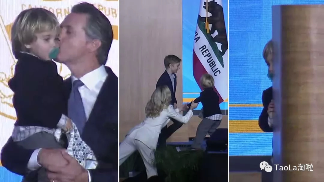 就在纽森在台上,挥洒自己建筑“加州梦”的宏伟抱负时,他两岁的儿子,咬着奶嘴,拿着口水毛巾,蹒跚想上台去找爸爸,懂事的哥哥见状赶紧拉他,可是没成功,小家伙意外抢了镜。