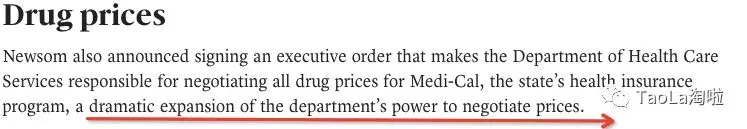纽森宣布签署一份行政令,要求加州健保局负责加州医疗保险计划(Medicare - cal)所有药品的价格谈判,这大大扩大了该部门的价格谈判权力。如果能把药品价格谈下来,相信老百姓看病的成本会降低,减负不少。